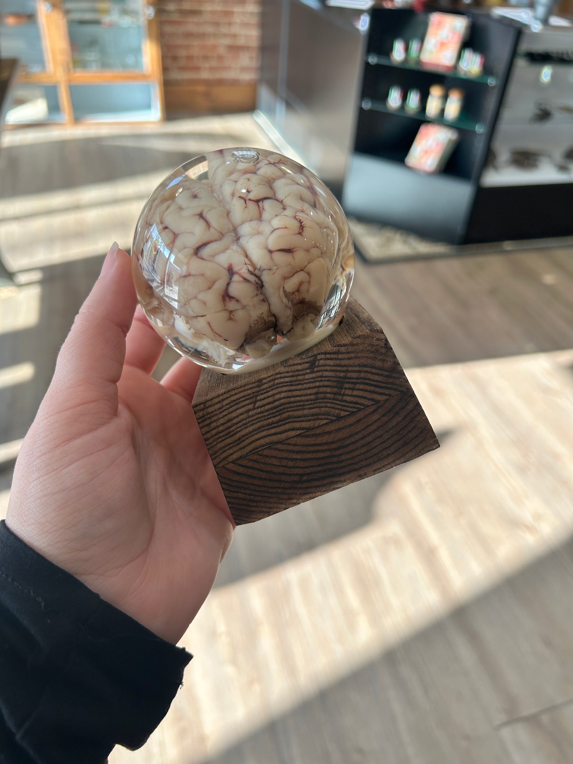 A true conversation piece, this 3-inch glass globe holds a preserved sheep brain, suspended for display. Both intriguing and educational, it offers a rare glimpse into anatomical structure while doubling as a striking oddity for your collection.